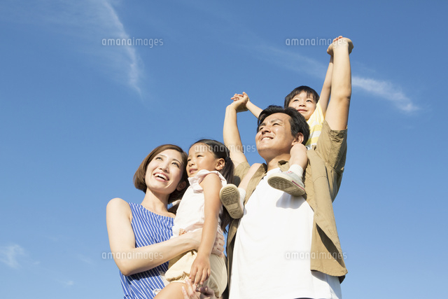 青空の下笑顔の家族 10626001837 の写真・イラスト素材アマナイメージズ。
