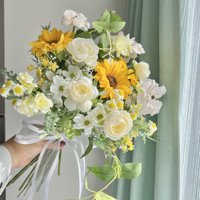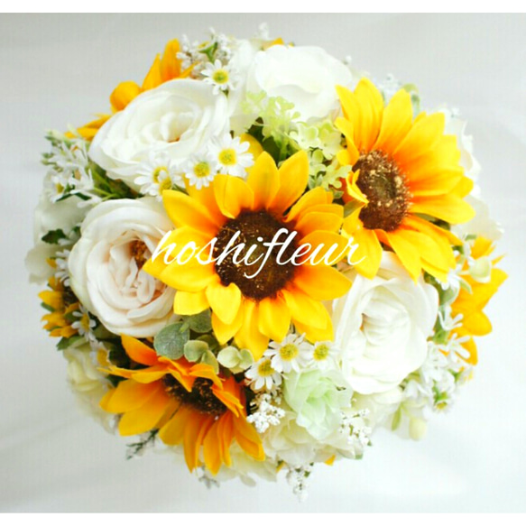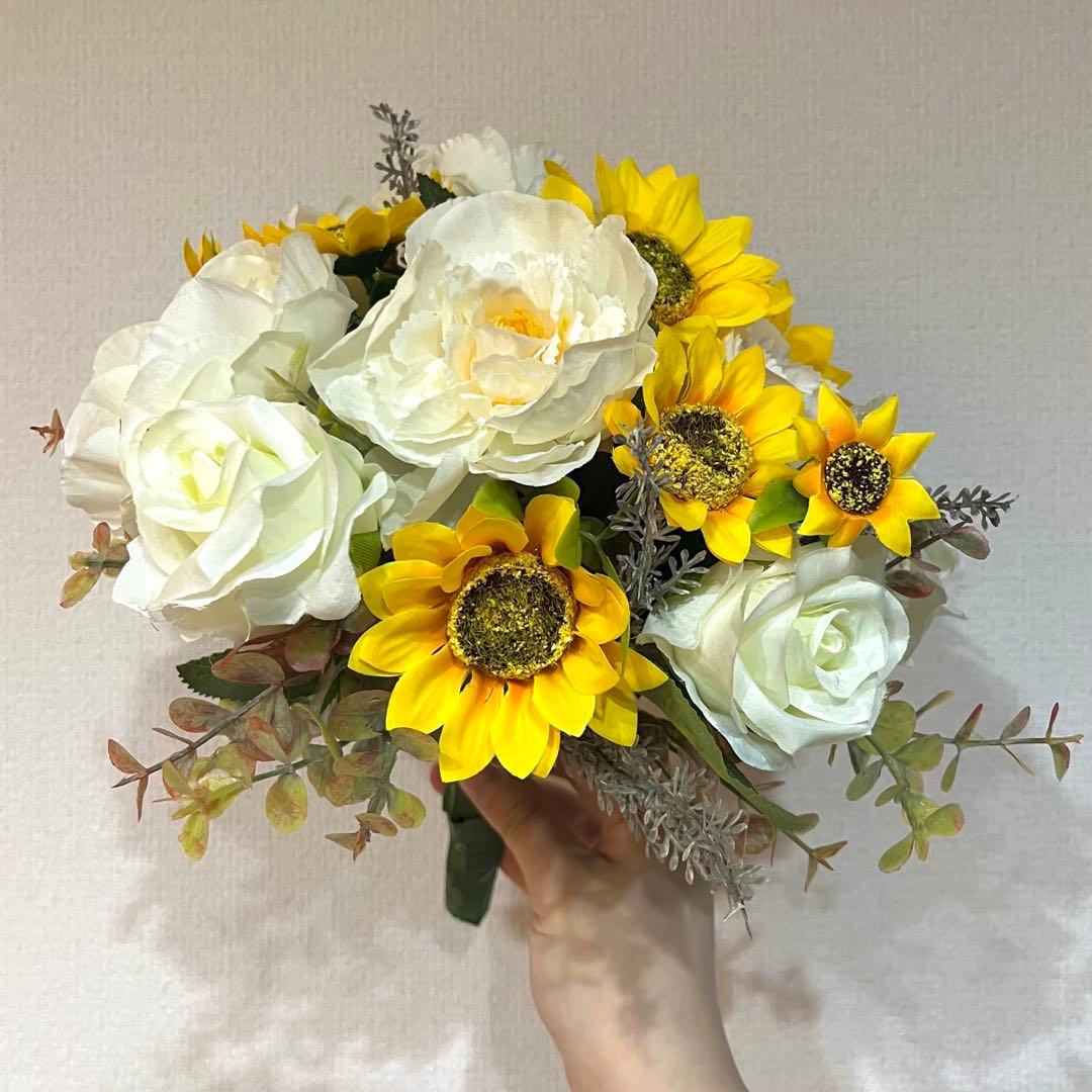 ひまわりのナチュラルブーケ💛💚イエローandホワイトandグリーンのラウンドブーケ ウェディングブーケ アーティフィシャルフラワー ひまわり前撮り 結婚式 ウェディング - ANDMOON39'S GALLERYminne byGMOペパボ 国内最大級のハンドメイド・手作り通販サイト。