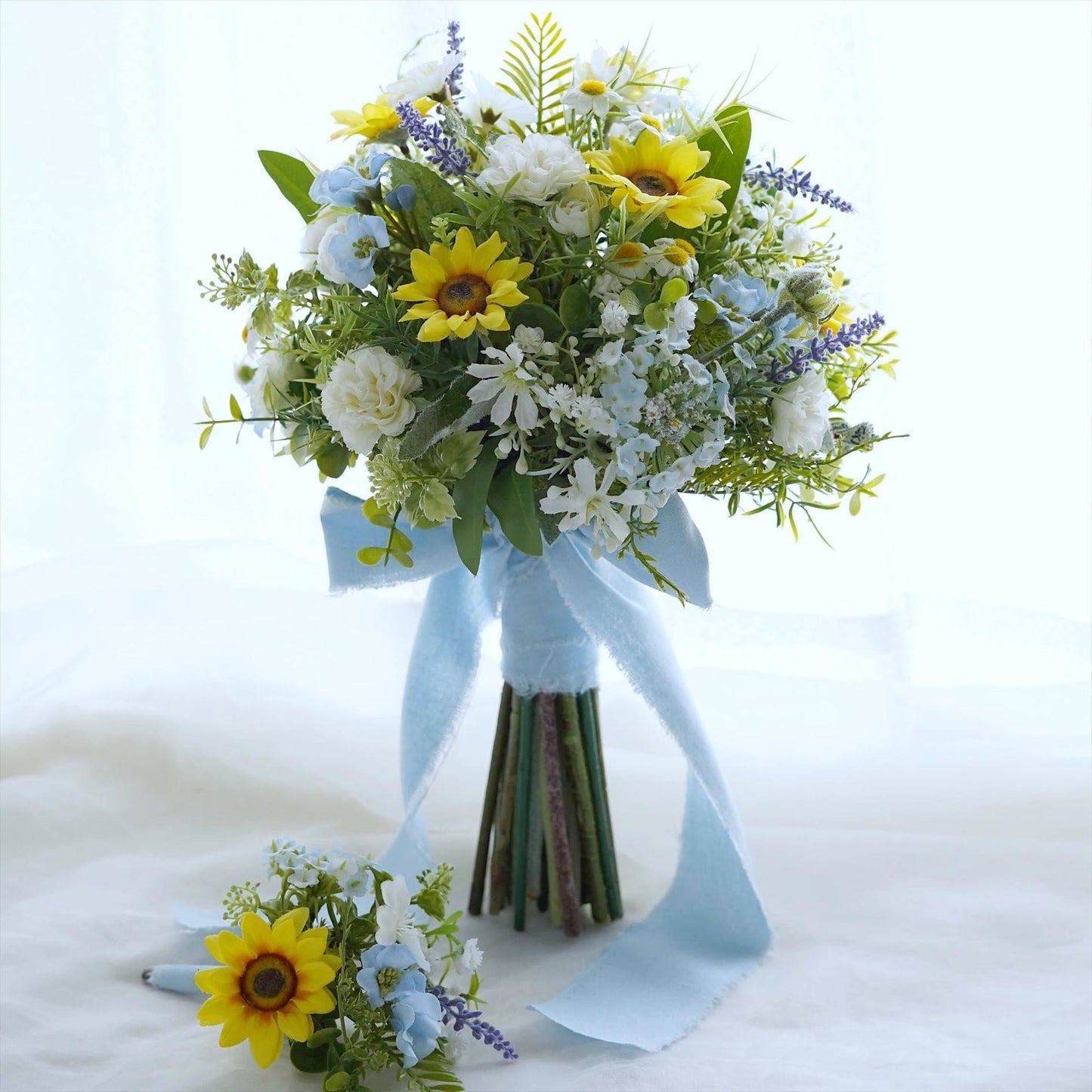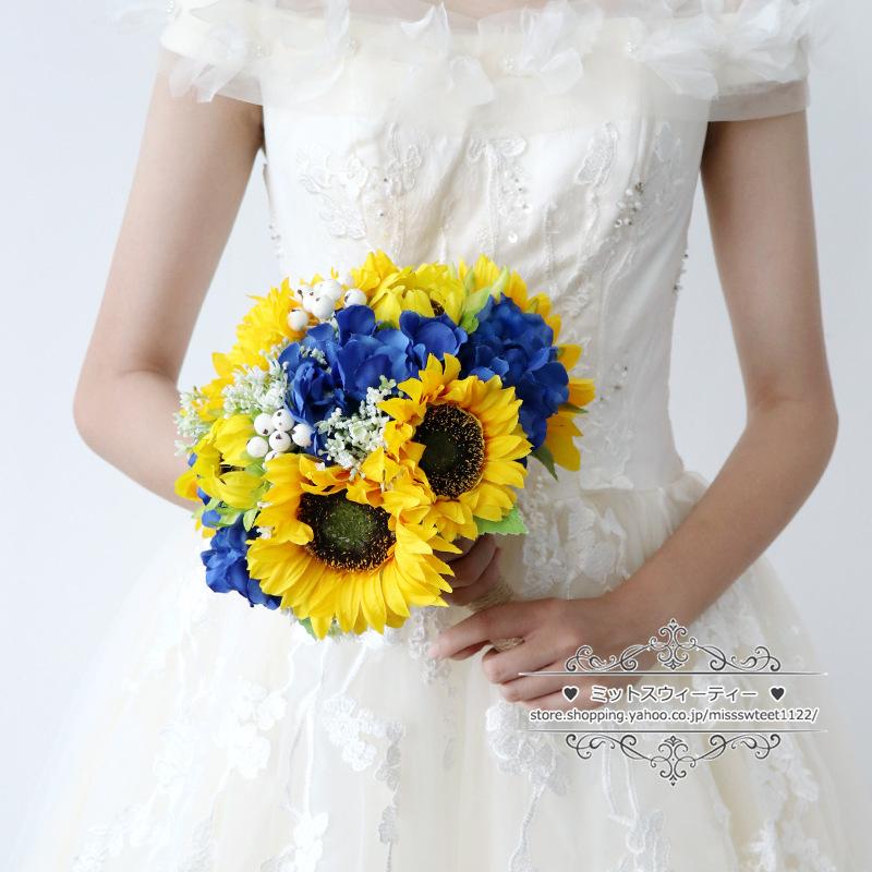 ウエディングブーケ 結婚式 ブーケ 花嫁 二次会 披露宴 向日葵 ブルー 造花 前撮り 海外挙式 ウェディングブーケ ブライダルブーケ インテリアアートフラワー ≪人気≫ウェディングブーケ 花嫁 ウエディングブーケ造花 ひまわりの花束 フェイクフラワーブーケ パーティー。