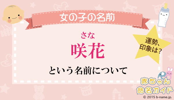 咲花 さな 」という全ての名前の姓名判断結果や「咲花」と書く全てのその他のよみ例や字画数名前を響きや読みから探す赤ちゃん名前辞典完全無料の子供の名前 決め・名付け支援サイト「赤ちゃん命名ガイド」。