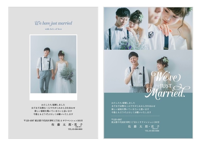 結婚報告はがき 無料テンプレート Andante 商用利用可和風 洋風 フォトフレーム テンプレート 文例。