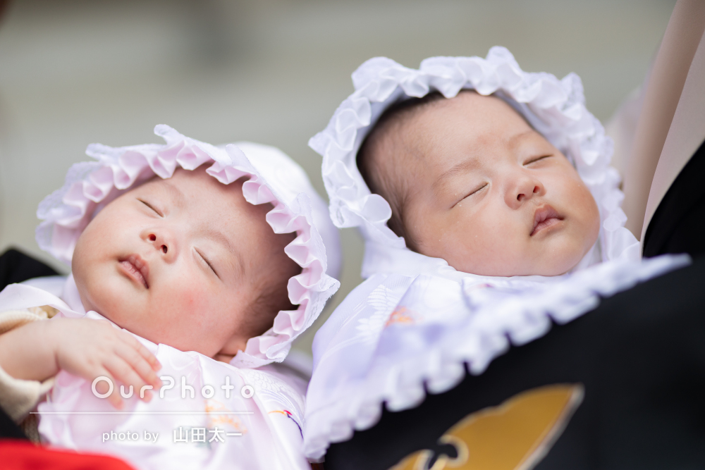 男女の双子赤ちゃんが可愛い!笑顔いっぱい和やかムードのお宮参りの撮影OurPhoto アワーフォト。