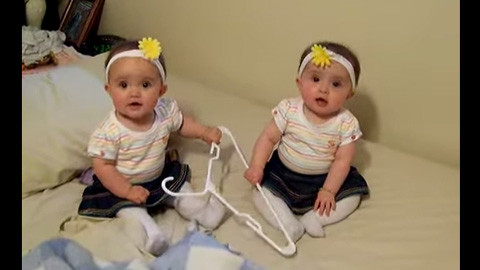 キュートすぎる双子の赤ちゃん、ハンガーを取り合うあかちゃん動画。