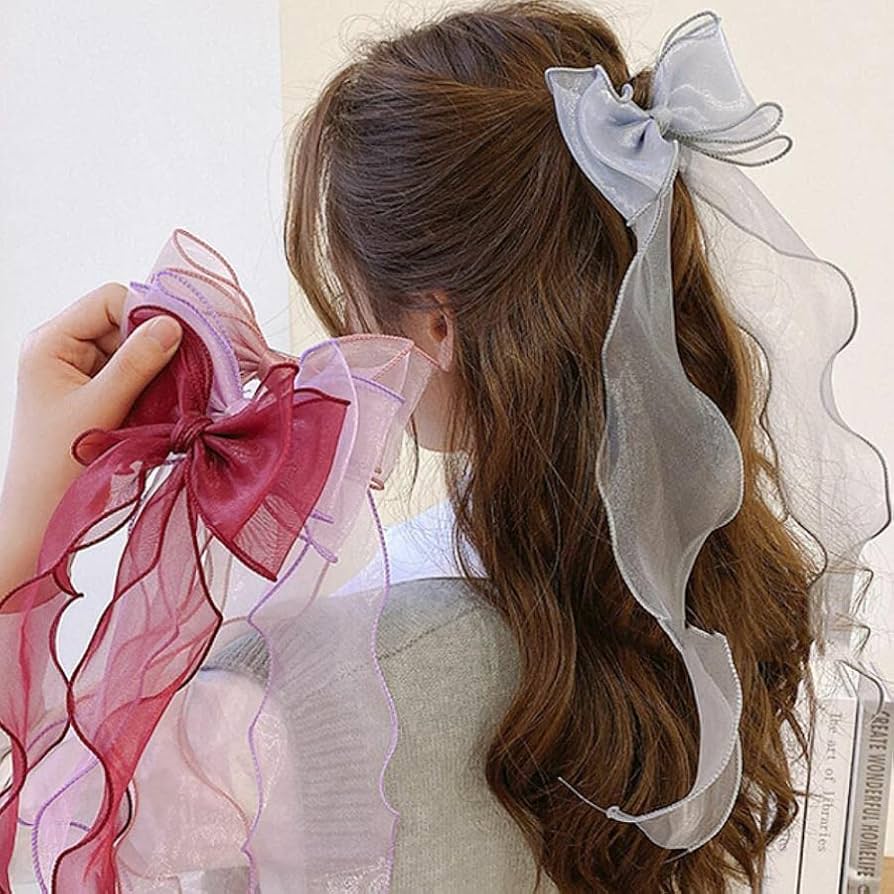 楽天市場 リボンバレッタ アンジュ リボン オーガンジー リボン 大きめ リボンヘアピン ダブルリボン チュール ヘアクリップ 編み込み ロングテールパール付き キッズ 子供 ジュニア ヘアアクセ ヘアアレンジ アレンジ 大きなリボン かわいい yuyumo 三つ編み ヘア。