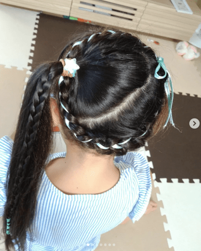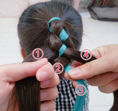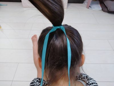 家で一緒にやってみよう 可愛く♡楽しく♡ヘアアレンジ講座リボン5つ編みのポニーテール。