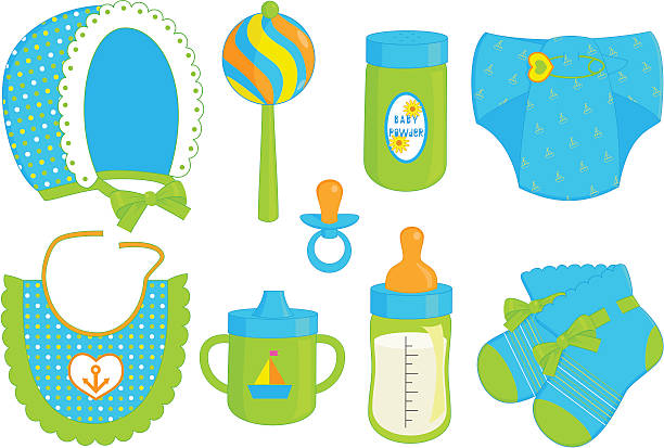 赤ちゃんの服、靴下、ゼッケン、おむつ、ボンネット、ロンパース、平ら、白い背景上の孤立したオブジェクト、ベクトルイラスト、のイラスト素材・ベクターImage 148690629。
