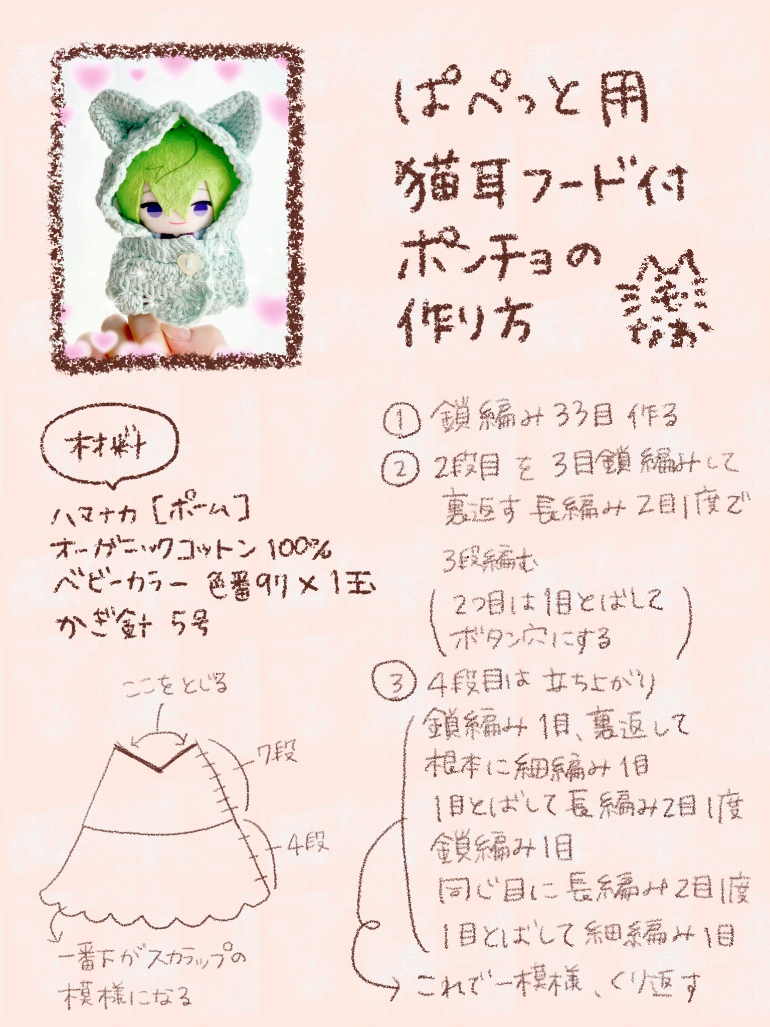 もなお🧚♂️👹 on X: " ハンドメイド編み図ぬいぐるみ ぱぺじめ用に作った猫耳フード付きポンチョ ケープ? の作り方をメモしました編み図ではないけど作り方の参考になれば🙌 https:t.co yvGhUetgD4"X。