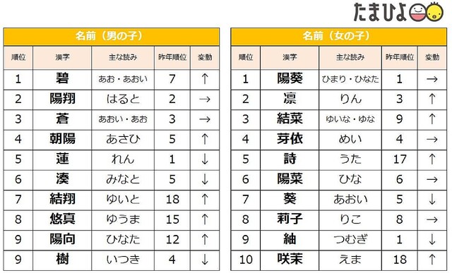 国内最多26万人調査 2024年赤ちゃんの名前ランキングを発表! 男女とも1位が入れ替わり、新たな名づけのトレンドも。さらに あの大人気アスリートの名前 が大幅ランクアップ!たまひよ。