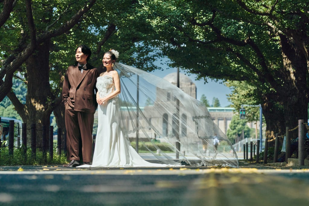 背後にイチョウ並木が広がる明治神宮外苑は前撮りの定番スポット東京ウェディングオンライン。