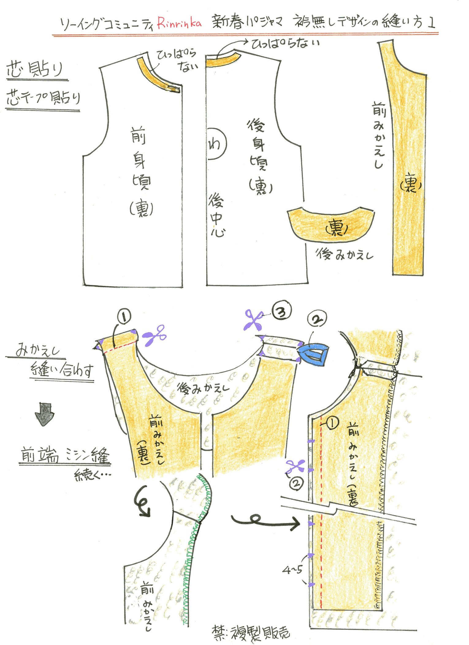 型紙+作り方 衿なしパジャマ 男女兼用 SS~LL 編み図・パターン ichica イチカ通販 3267040Creema クリーマ。