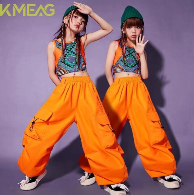 キッズ ダンス衣装 女の子 ヒップホップ ジャズダンス セットアップ オレンジ タンクトップ へそ出し カーゴパンツ ダンス衣装 hiphop ドラムステージ衣装 おしゃれ 子供服 応援団 チアダンス 体操服 K-pop JAZZ 発表会 演出服 舞台ステージ衣装 ダンス団体服。