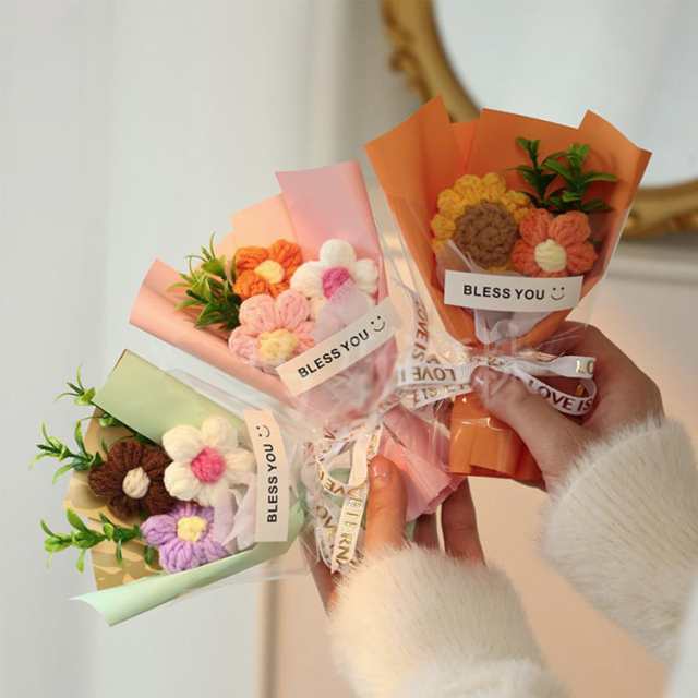 ニットブーケ かぎ針編み ミニブーケ 手作り花 造花 花束 毛糸 可愛い フラワー 子供 カラフル 飾り 記念日 ギフト プレゼント 誕生日枯れない花 贈り物。