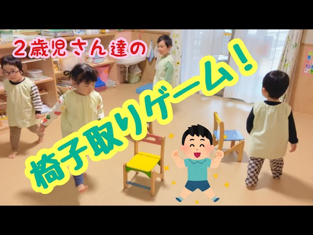 2歳児うさぎ組です。, 簡単なルールのある遊びに挑戦しています。, 先日、椅子取りゲームを行いました。,音楽が止まるとラバーリングの中に入ったり、椅子に座るのではなく、その場でピッと止まる可愛らしい姿も見られました。,ルールを理解し楽しめるようになると、座れなかった悔しさから涙を流す人もいました。悔しい気持ちも大切にしながら、ゲーム遊びのレパートリーを増やしていきたいです。,。