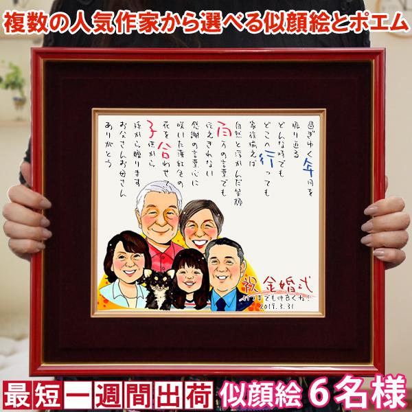 金婚式 プレゼント 両親 似顔絵ポエム 朱色色紙額 似顔絵 6人用 ネームインポエム 名前。
