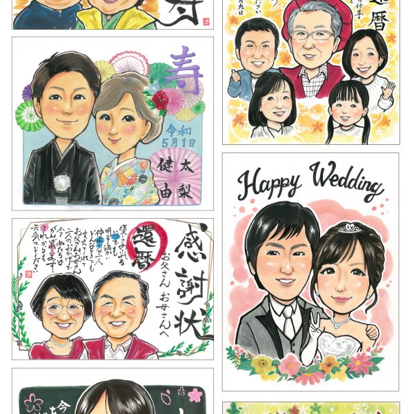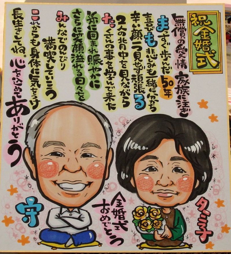 ご結婚や金婚式のお祝いの似顔絵入り寄せ書き色紙をお写真からお描きします似顔絵プレゼントや名前ポエムは千里画房に退職や長寿お祝い。