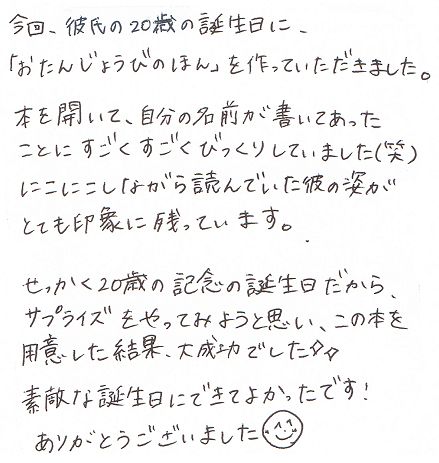 彼氏への誕生日プレゼントとしてご利用いただいたお客様からの感想彼氏、彼女、家族、友達へのサプライズプレゼント・ブログ。