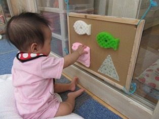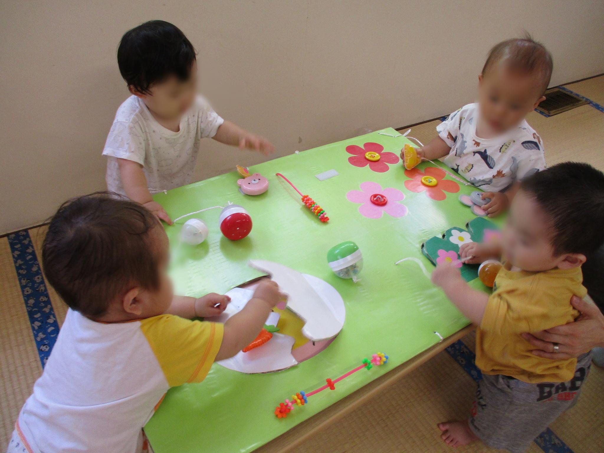 5 16 0歳児 手作りおもちゃで つまむ,引っ張る,にぎる 指先の発達のためにらいらっく保育園 常陸太田市の保育園社会福祉法人月居会。