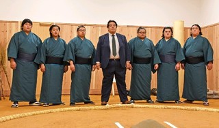 二子山親方 中央 と力士たち=飯塚市本町の二子山部屋稽古場 - 「結果残し、地域で喜びたい」 飯塚に初の宿舎、二子山部屋土俵祭り -写真・画像 1 1西日本新聞me。