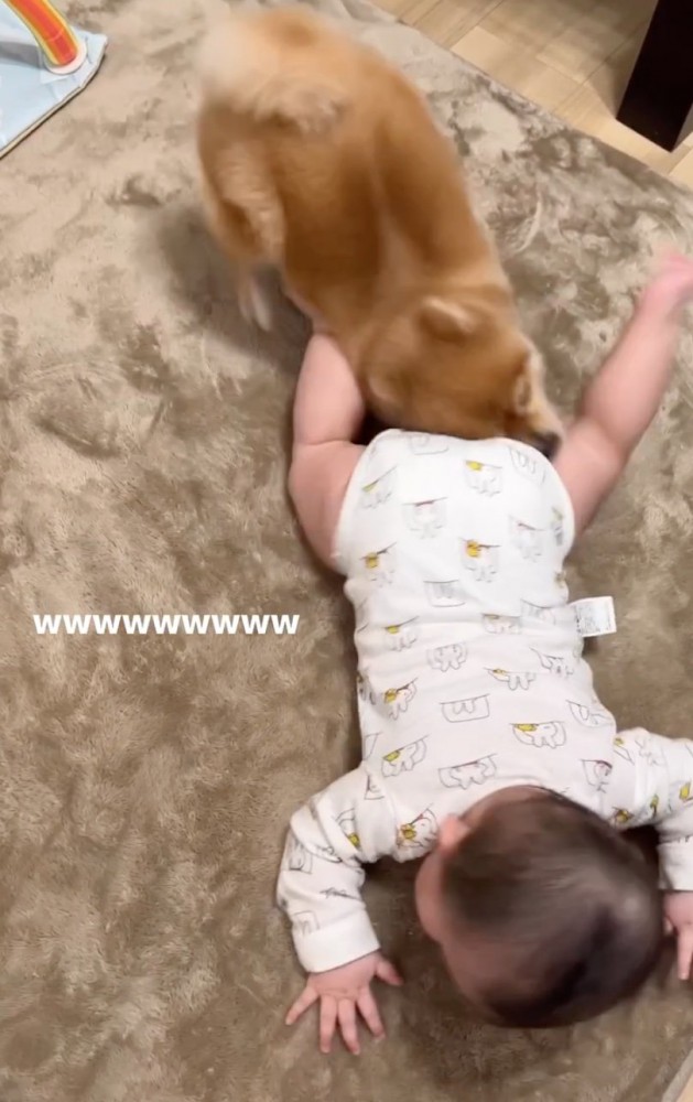 犬が『赤ちゃんの足に突進した』結果 想像以上に激しい『ふたりの攻防戦』が面白すぎると話題に「なにしてんのww」「高度な戦いで草」わんちゃんホンポ。