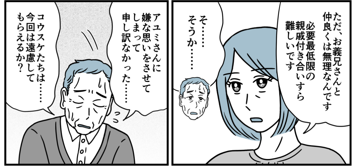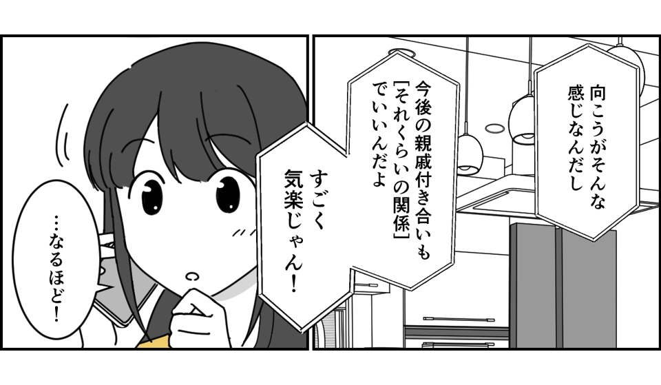 義家族とのキョリ感>最低限のお付き合いでOK?平和な関係を望んだ私たち夫婦の結論 後編まんがママスタセレクト。