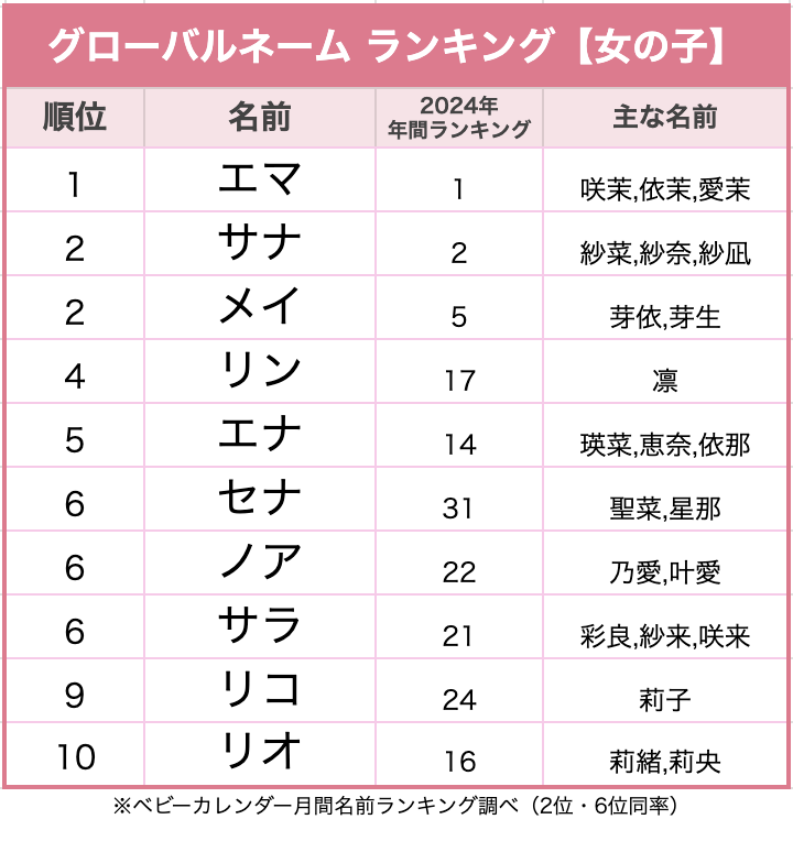 海外で活躍する子に ☆「グローバルネーム」がトレンド!2024年上半期、女の子に人気の名前は?ベビーカレンダ。