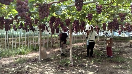 富士の輝の収穫を始めました。 濃厚でコクのある甘さが特徴のブラックシャインマスカットと言われるぶどうです。 貫禄のあるぶどうで収穫の際にずっしりとします。天山葡萄園富士の輝ブラックシャインマスカットぶどう畑が織りなす風景勝沼。