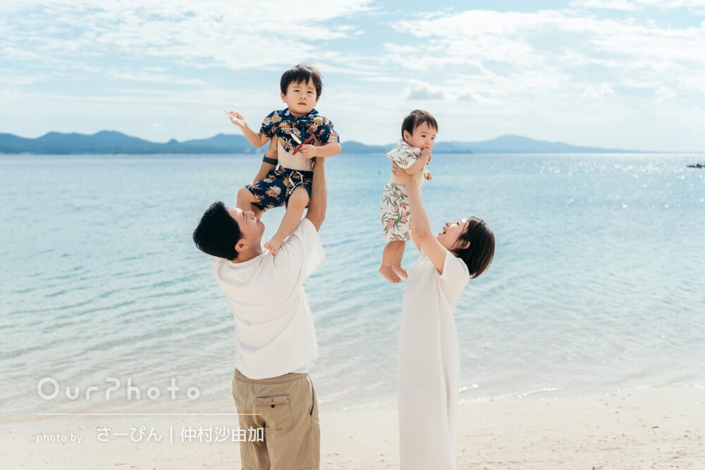 楽しく撮影」仲良く白シャツのリンクコーデ!美しい海と家族写真の撮影OurPhoto アワーフォト。