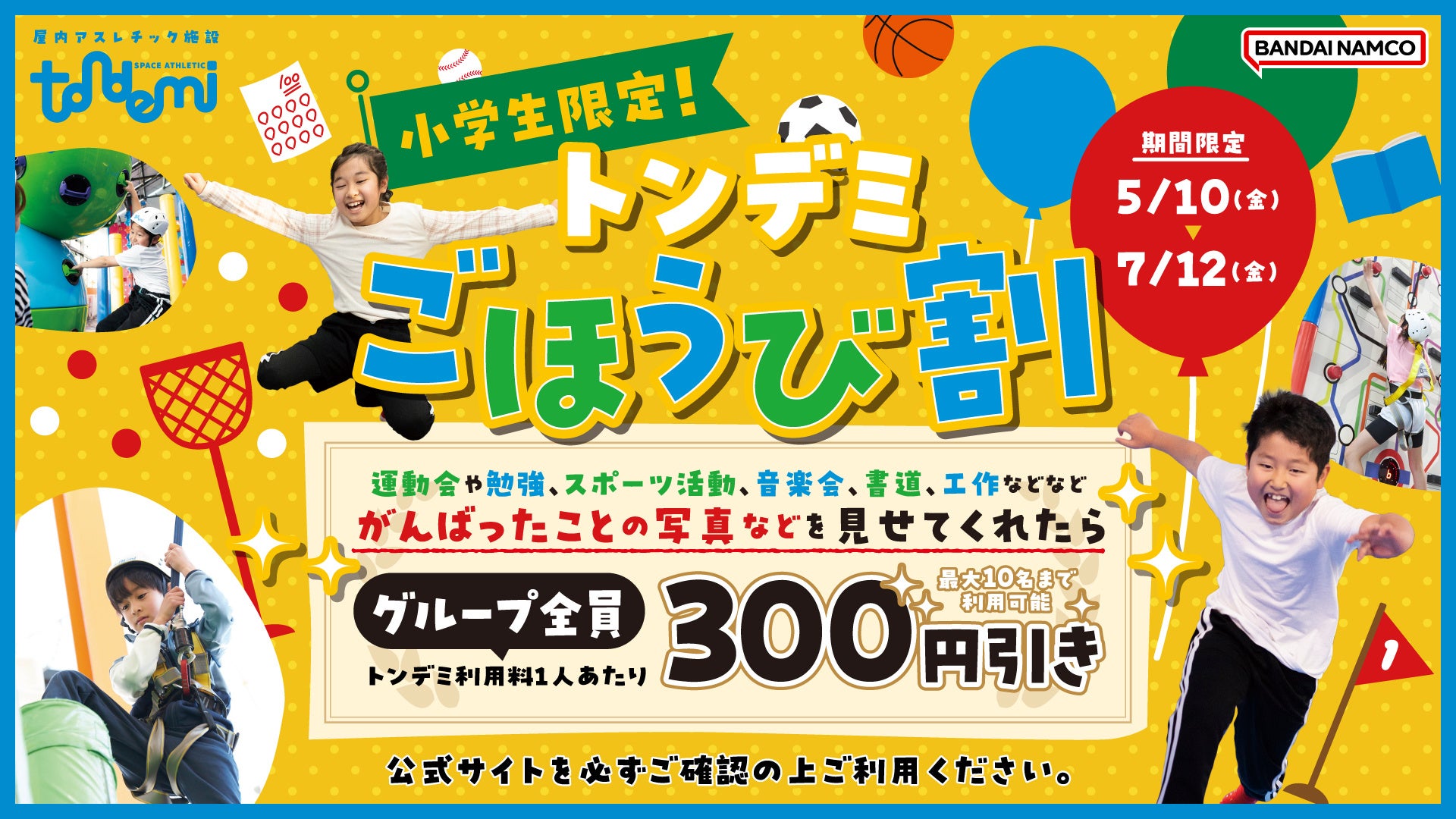 運動会やテストなど、頑張ったごほうびに!小学生限定のお得な「ごほうび割」 全国のトンデミにて5月10日 金 より開始!株式会社バンダイナムコアミューズメントのプレスリリース。