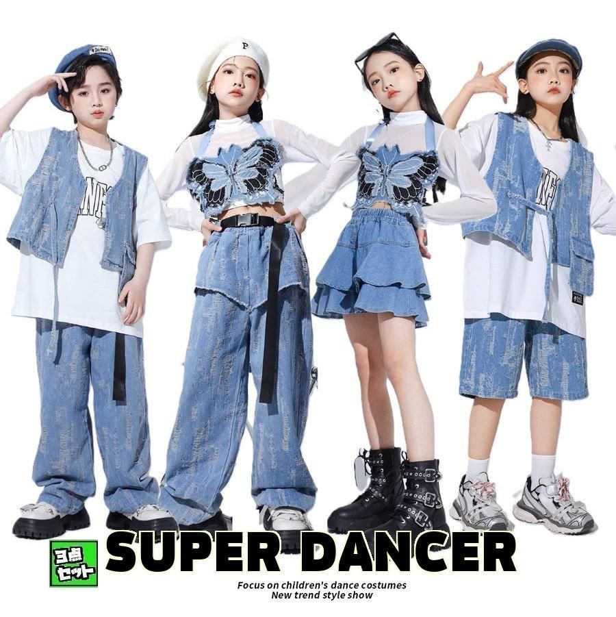 ヒップホップ ダンス衣装 ガールズ K-POP 韓国 キッズダンス衣装 セットアップ 派手 デニム トップス 穴あきレースパンツ ダンスウェア子供ダンス服 ダンス衣装 セットアップ ガールズ ヒップホップ ファッション K-POP 韓国 ダンスウェア キッズダンス衣装 トップス。