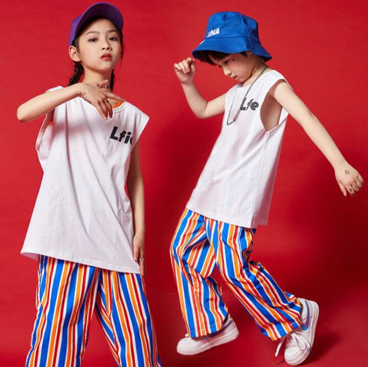 楽天市場 子供 ダンス衣装 キッズ ユニセックス HIPHOP JAZZ ストリートダンス衣装 ミドル丈 白いタンクトップ カラーストライプパンツレインボー 長ズボン 女の子 男の子 ゆったり おしゃれ カジュアルパンツセット 幼稚園 小学生中学生 発表会 ダンス会 演出服 110。