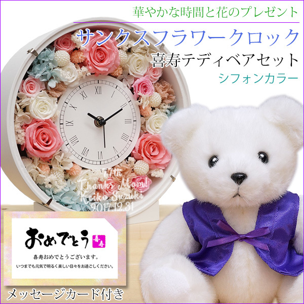 楽天市場 喜寿祝い 紫色のちゃんちゃんこを着た 『喜寿ベアセット サンクスフラワークロック』<丸型 シフォンカラー 名入れありメッセージカード付> 時計 プリザ ガラス 置時計 女性 母 喜寿 お祝い 77歳 祖母 おばあちゃん くま ぬいぐるみ プレゼント ギフト 喜ぶ。