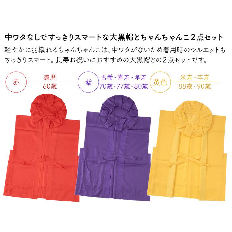 還暦 お祝い 長寿セット ちゃんちゃんこ 敬老の日 還暦祝い プレゼント 大黒帽 男女兼用 赤 紫 黄色 男性 女性 古希 喜寿 傘寿 米寿 卒寿メール便限定送料無料。
