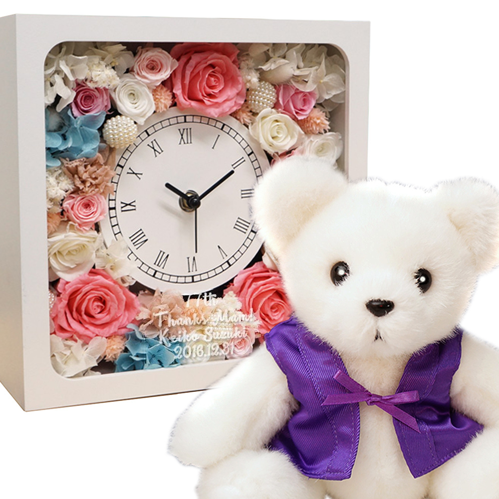喜寿 祝い 紫色のちゃんちゃんこを着た 『喜寿ベアセット サンクスフラワークロック』<角型 シフォンカラー 名入れなし メッセージカード付> 時計プリザ ガラス 置時計 女性 母 喜寿祝い 77歳 祖母 おばあちゃん くま ぬいぐるみ プレゼント ギフト 喜ばれる 贈り物。