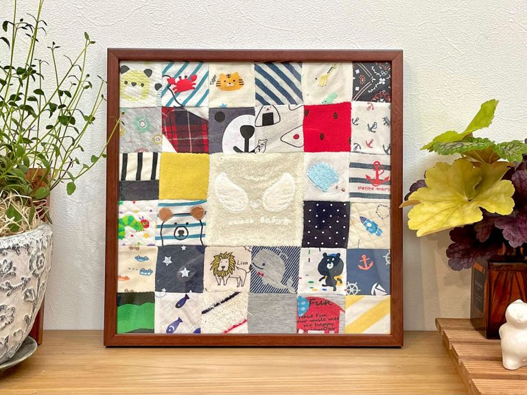 思い出の布で作る メモリアルフレーム ベビー服 子供服 ハギレ リメイク 刺繍 DIY。