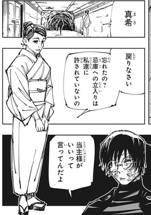 がはら on X: "呪術新刊。初読では死滅回遊のるーるもそうだが、真希パイセンの母親への「あの時なんで『戻れ』って言ったの?」の意味も分からんかった。これ、真希パイセンが禅院家の忌庫に入ろうとした時、オカンが止めたことを指して言ってるのか。 https:t.co。