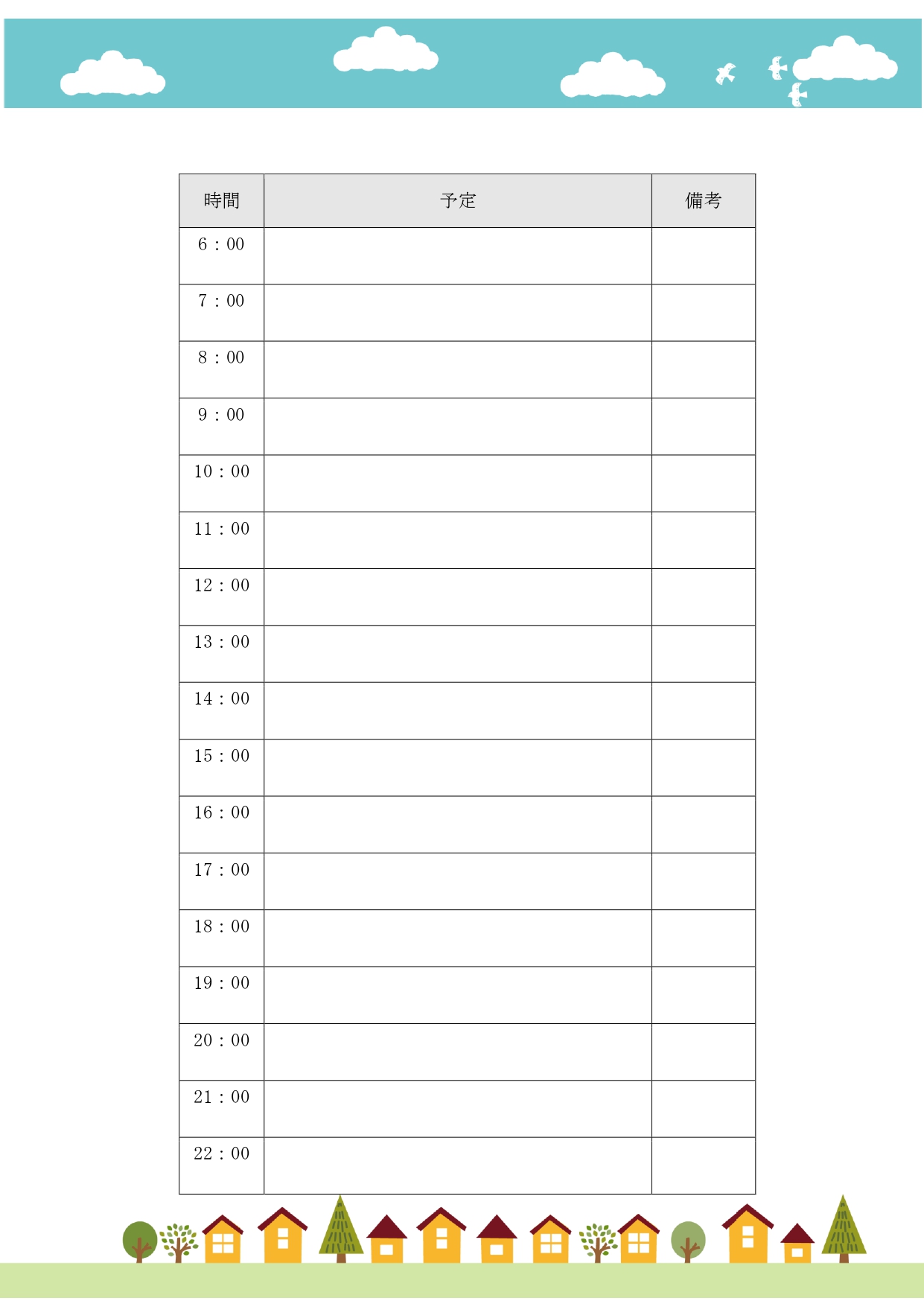 1日タイムスケジュール表・大空と街並みのかわいいイラストデザイン!日報・業務報告書や予定 イラストボックス「プレミアム」テンプレート。