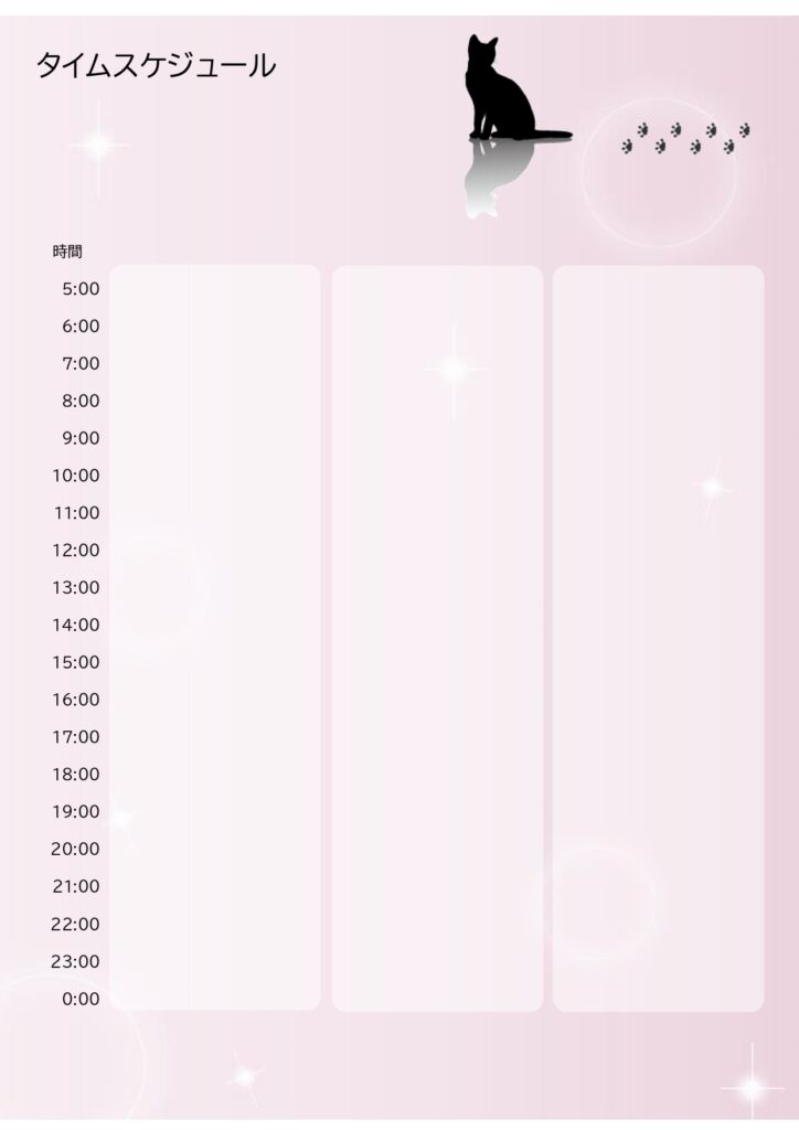 1日スケジュール表のテンプレート・猫と足跡のかわいいイラストデザイン・朝から夜までの予定 イラストボックス「プレミアム」テンプレート。