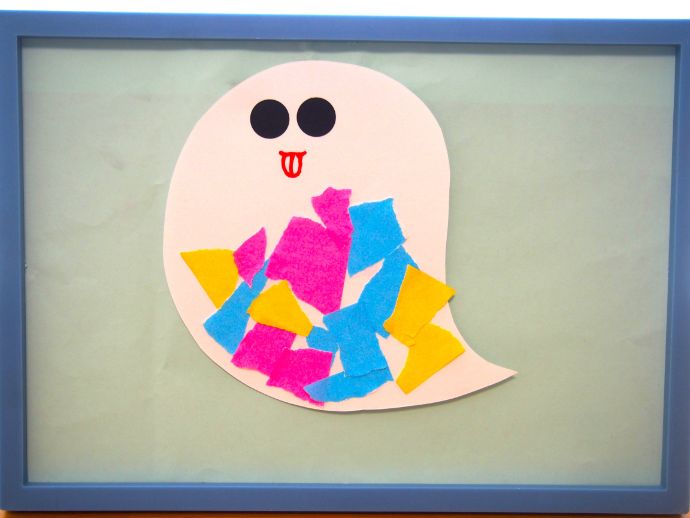 ハロウィン製作2歳児3歳児 ハサミで簡単!カラフルおばけの壁面。