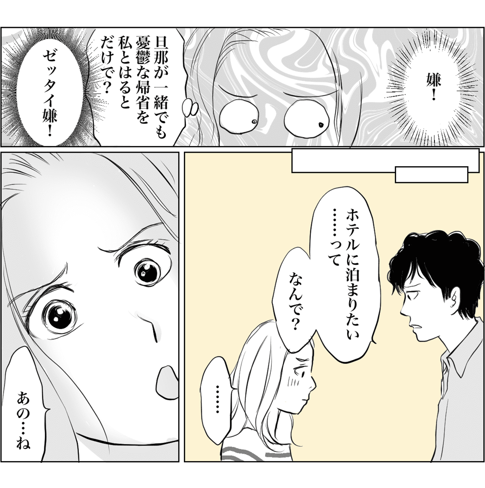義実家に泊まりたくない嫁>ついに義母へ伝える思い「今回の帰省はホテルに泊まる」 第3話まんがママスタセレクト。