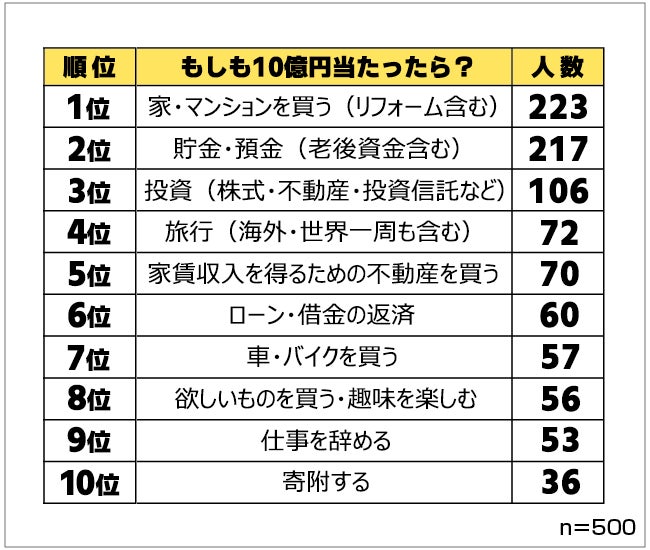 10億円当たったら?男女500人に夢を語ってもらったら使い道ランキングがおもしろかった保険マンモス株式会社のプレスリリース。