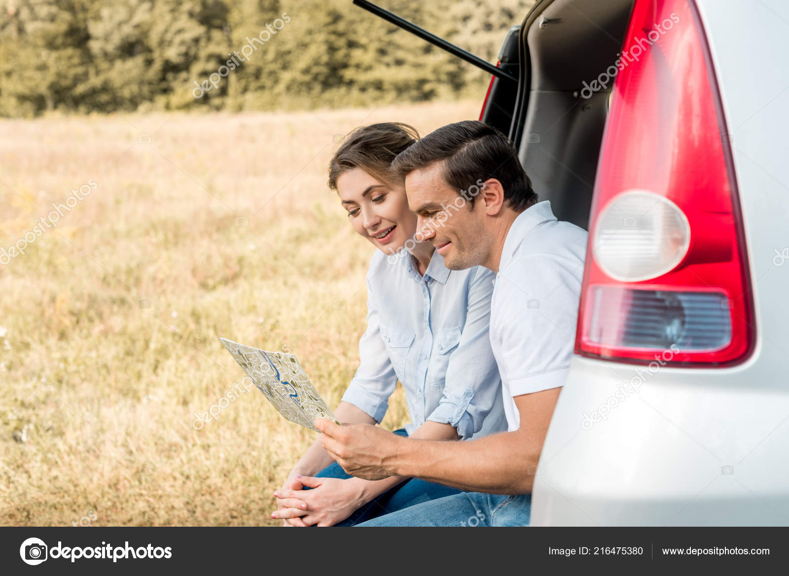 車のトランクに座っていると地図を見て幸せな大人のカップル — ストック写真 © IgorVetushko216475380。