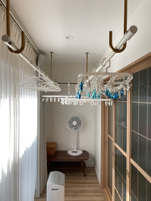 縁側にホスクリーンを設置して雨の日でも洗濯物を干せるように注文住宅新築インテリア住宅施工事例リノベーション家づくりアイデアリフォームマイホーム匠工房縁側室内干しスペースホスクリーン。