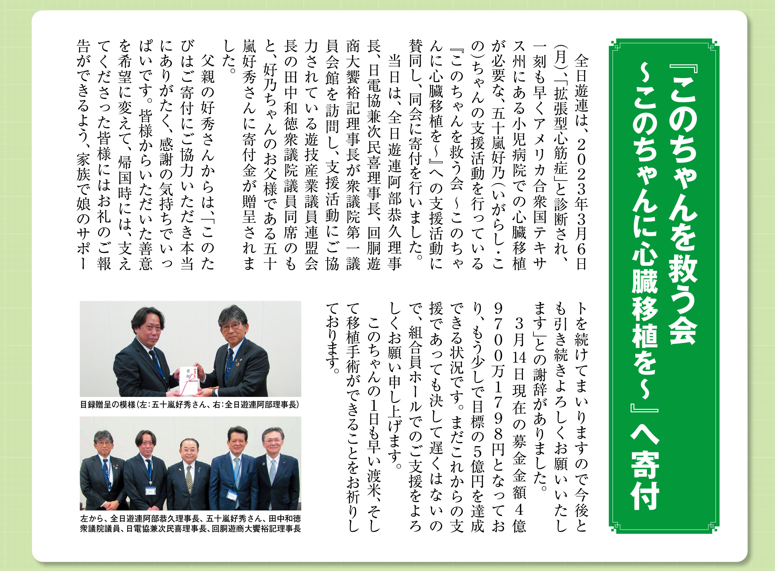 このちゃんを救う会~このちゃんに心臓移植を~』へ寄付全日本遊技事業協同組合連合会。