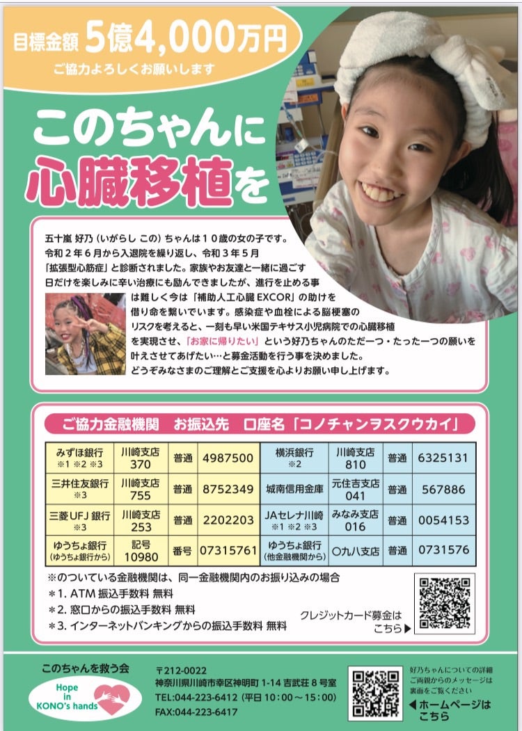 五十嵐 好乃 いがらし この ちゃんの心臓移植に関する 募金の協力依頼について。