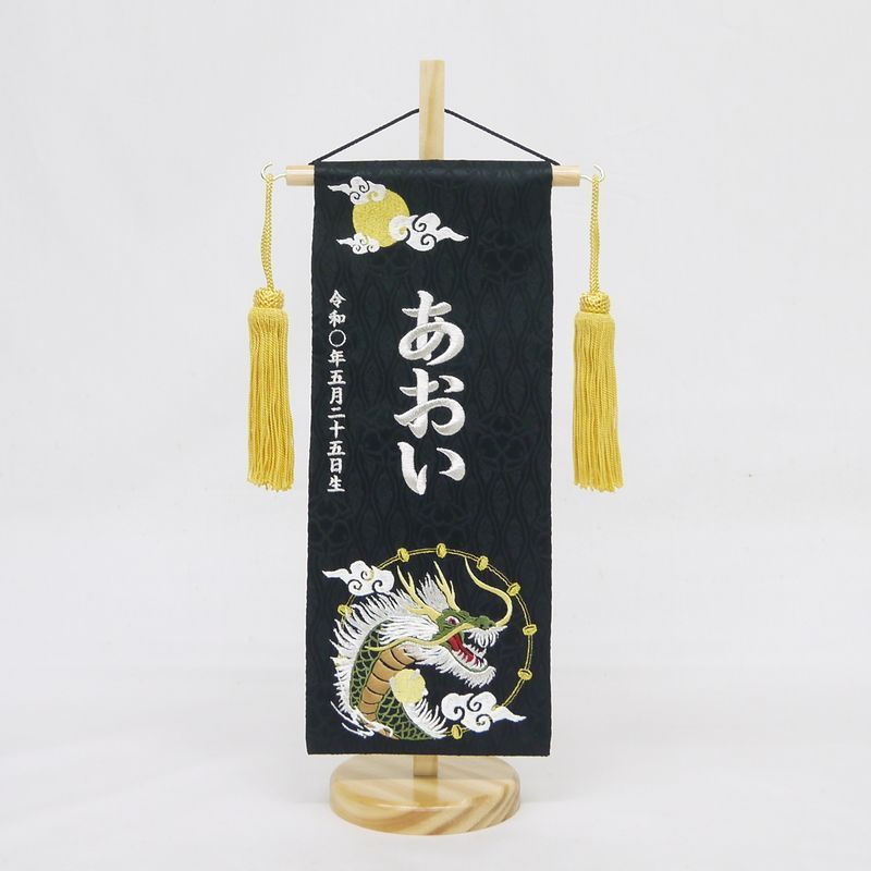 名前旗 小サイズ 刺繍 男の子名入れ代込土台セット月と龍 黒。