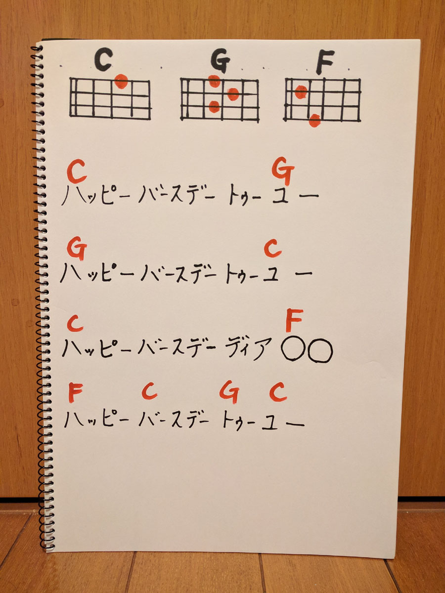 ウクレレで弾くハッピーバースデーのコードを初心者向けに写真付きで解説します。