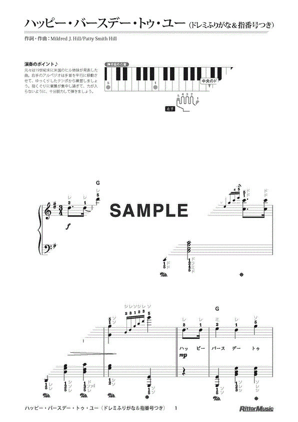 ピアノ楽譜 ハッピー・バースデー・トゥ・ユー ドレミふりがな&指番号つきMildred J. Hill Patty Smith Hill ソロ初~中級。