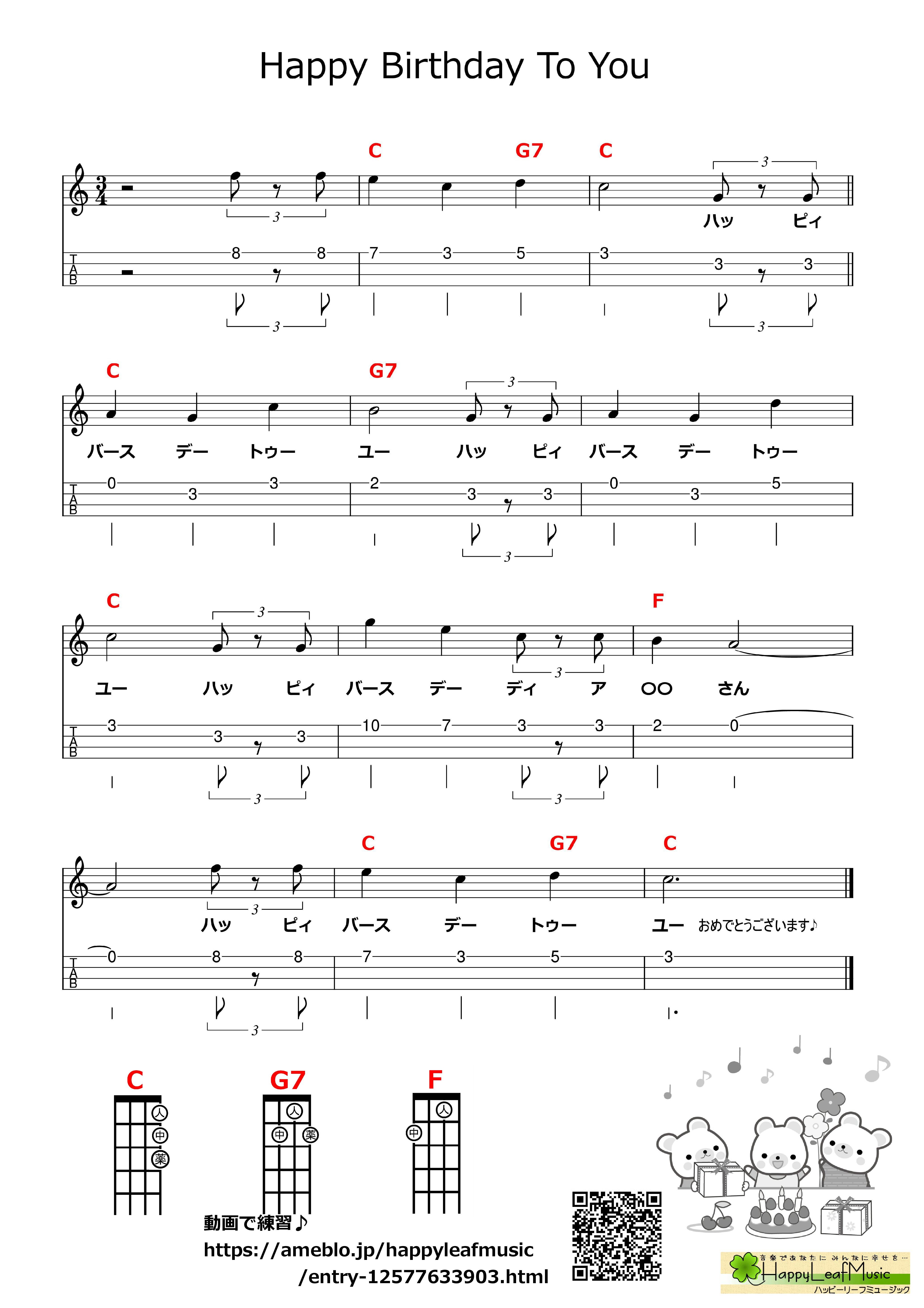 ハッピーバースデートゥーユー 歌詞・コード 無料楽譜 初心者用かんたんソロウクレレ タブ TAB 譜 Happy Birthday to YouPAKANE。