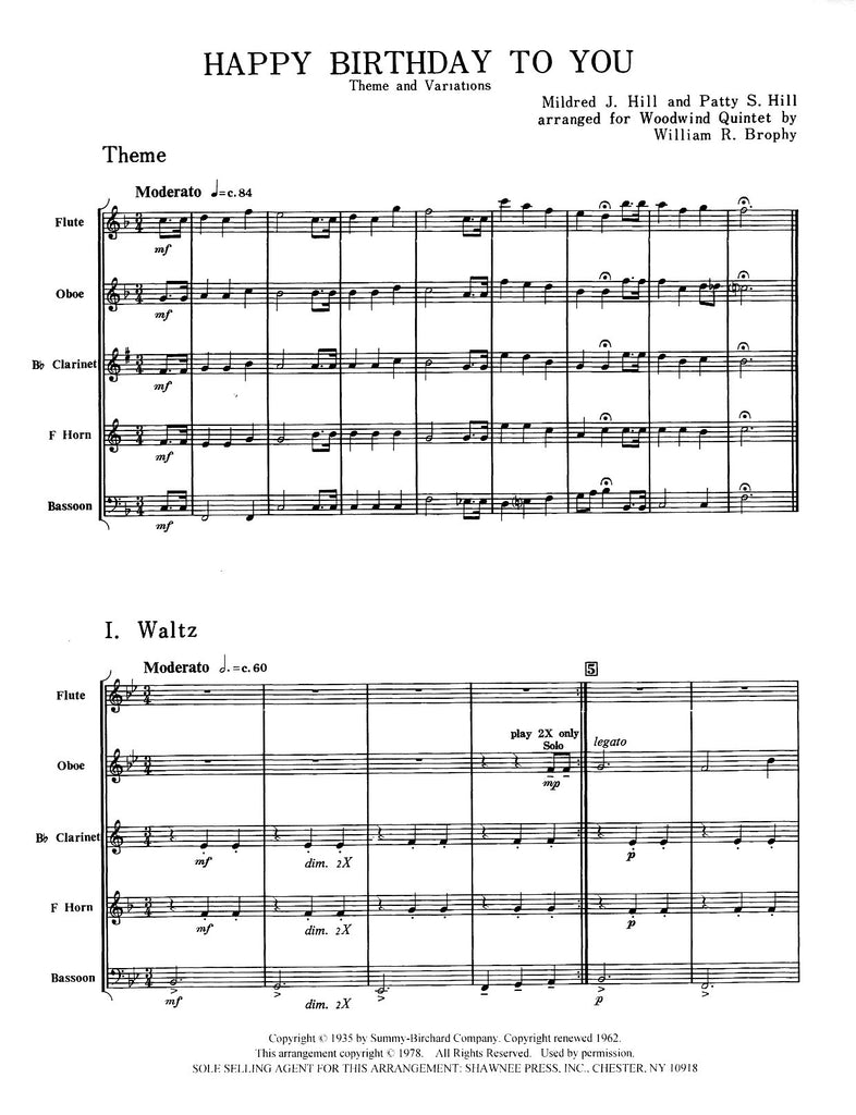 ハッピー・バースデイ・トゥー・ユー木管五重奏Happy Birthday to You- Hill, Mildred & Patty -吹奏楽の楽譜販売はミュージックエイト。
