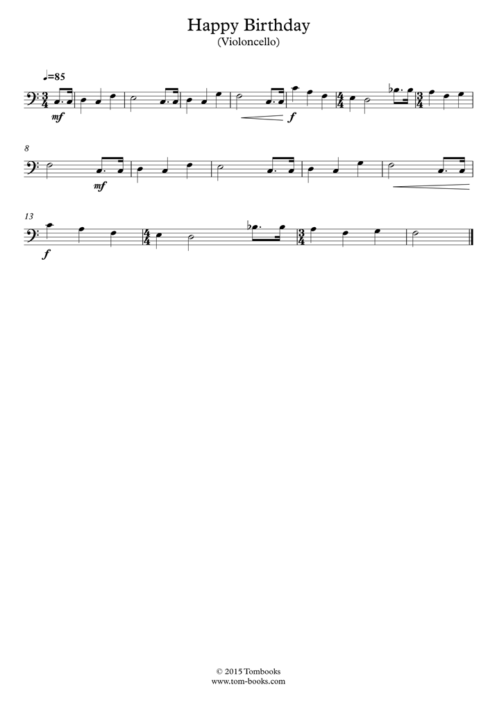 ハッピー・バースデー 初級伝承曲- チェロ 楽譜。